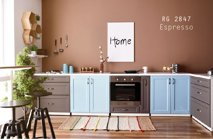 Những tông màu đỏ, nâu đất…. có tính chất nóng, sưởi ấm khôn gian lạnh. Để không gian không quá bí bách và nóng nực, chúng ta có thể phá cách với cảnh cửa màu xanh nước biển kết hợp với tông màu trắng kiềm lại, cũng góp phần cho căn bếp sống động và vui tươi hơn.