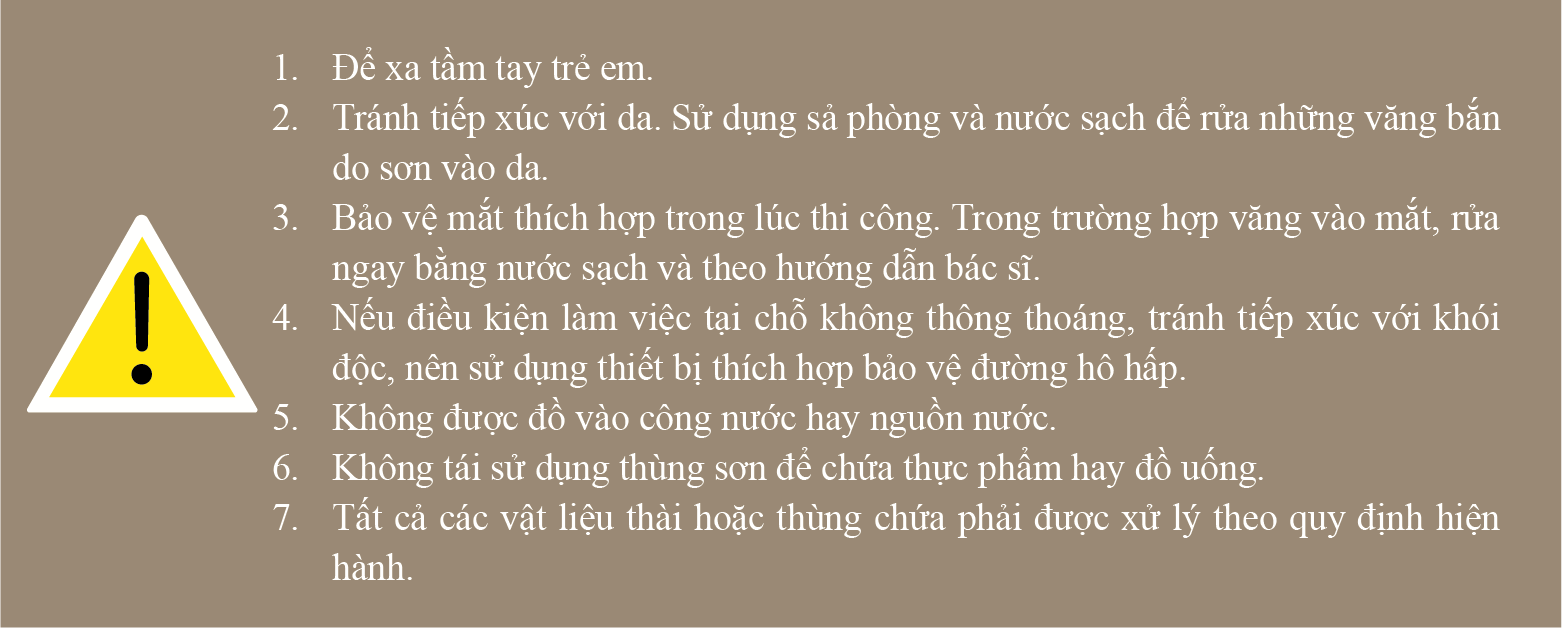 Bảo quản ở nơi khô mát, thoáng khí. Đặt thùng sơn ở vị trí thẳng đứng, an toàn và đậy chặt nắp.