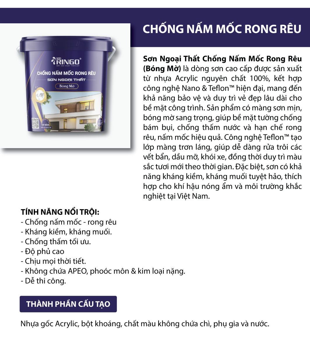 | Sơn ngoại thất RINGO Chống Nấm Mốc Rong Rêu | 02 lớp |
